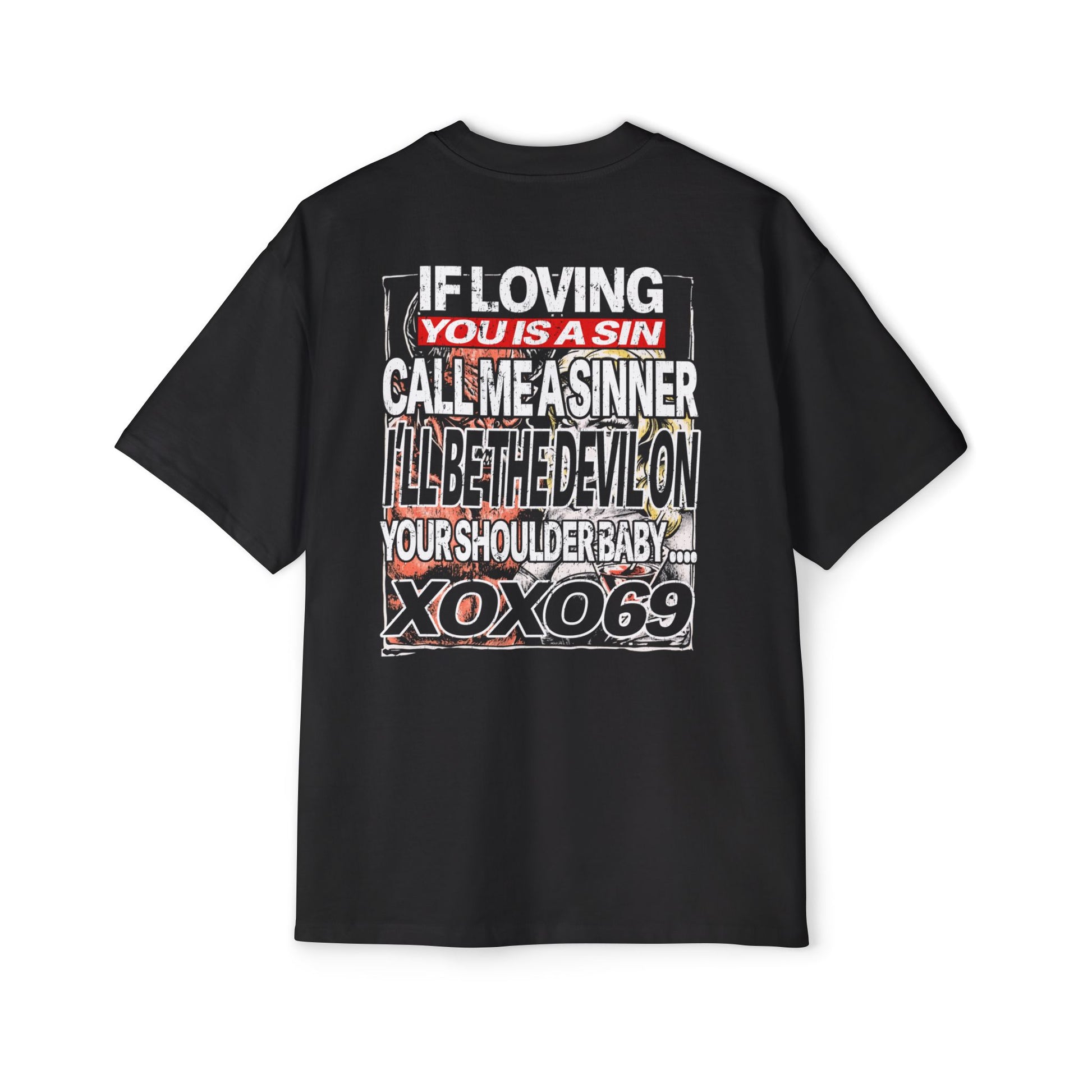 A bold oversized tee that channels vintage horror-pulp energy with cheeky, rebellious attitude. The front graphic pairs a snarling beast with a sultry blonde in a retro comic-frame layout, while the back declares audacious lines that flirt with sin and swagger. The medium-heavy carded cotton feel and dropped shoulders create an easy, lived-in silhouette that wears like a favorite record sleeve—rough around the edges but full of character. Slip it on when you want to stand out at late-night shows, underground parties, or city strolls; it reads like a statement piece for anyone who prefers edge over polish and story over silence.