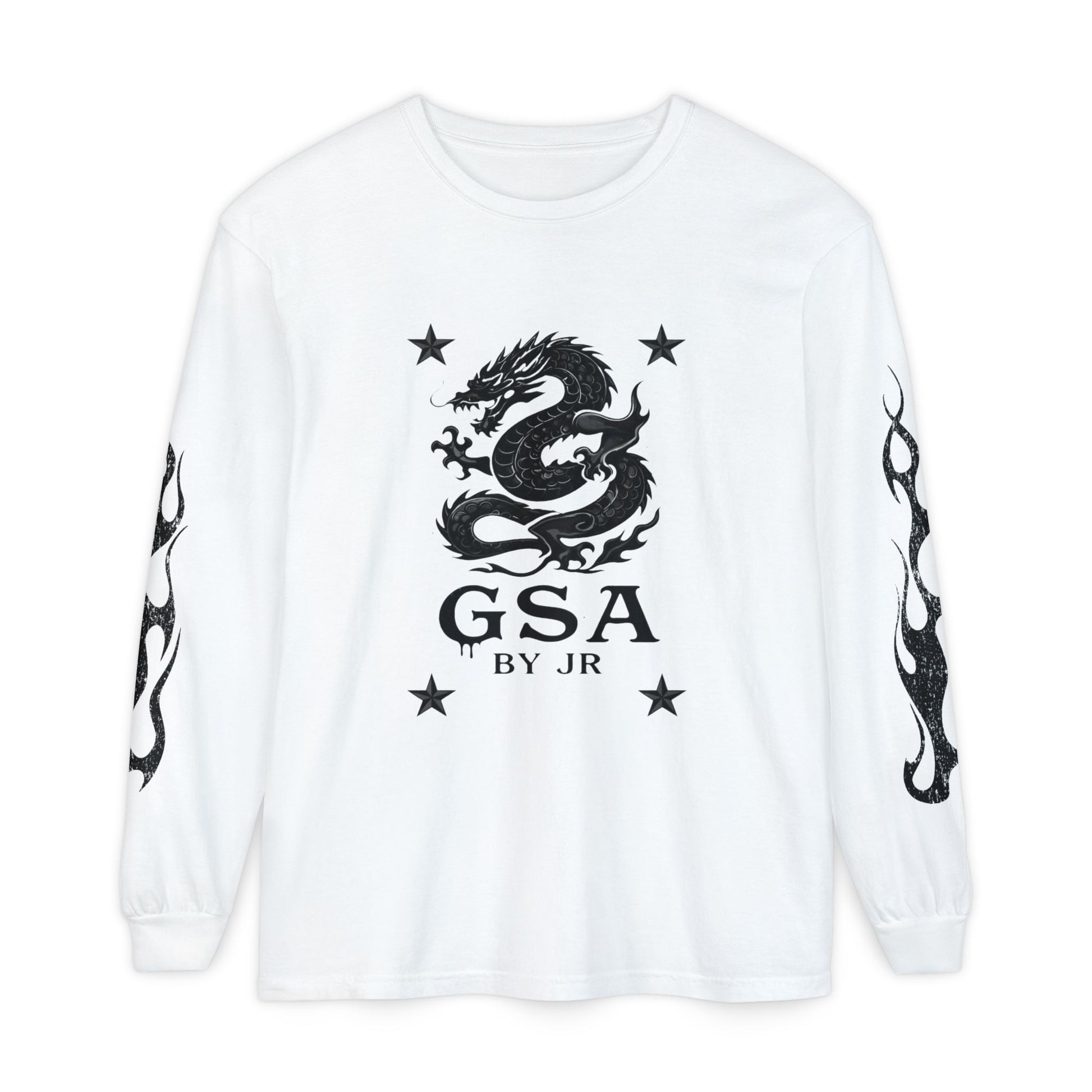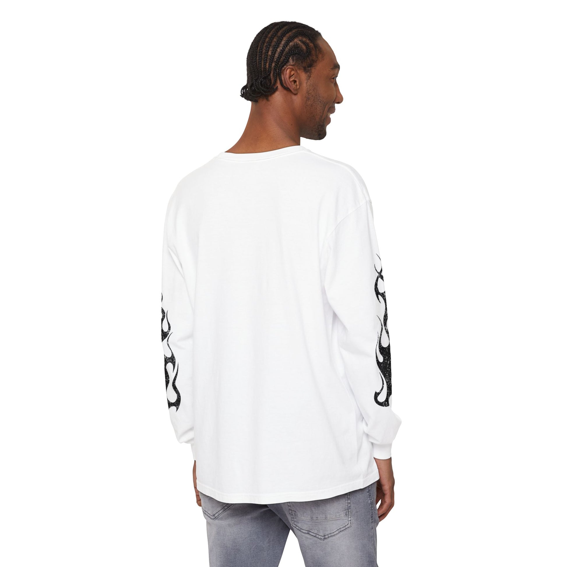 A garment-dyed long sleeve that feels lived-in from the first wear. The heavyweight-yet-supple cotton holds a bold black dragon print on the chest and matching flame panels down each sleeve. It sits with a classic, slightly roomy cut and ribbed cuffs that keep sleeves in place while you move. Wear it layered under a denim jacket or alone when you want an effortless, streetwise look that reads tough but comfortable. The muted, garment-dyed color and sturdy double-stitched hems mean this shirt softens with age, not shape, becoming more personal with every wash.
