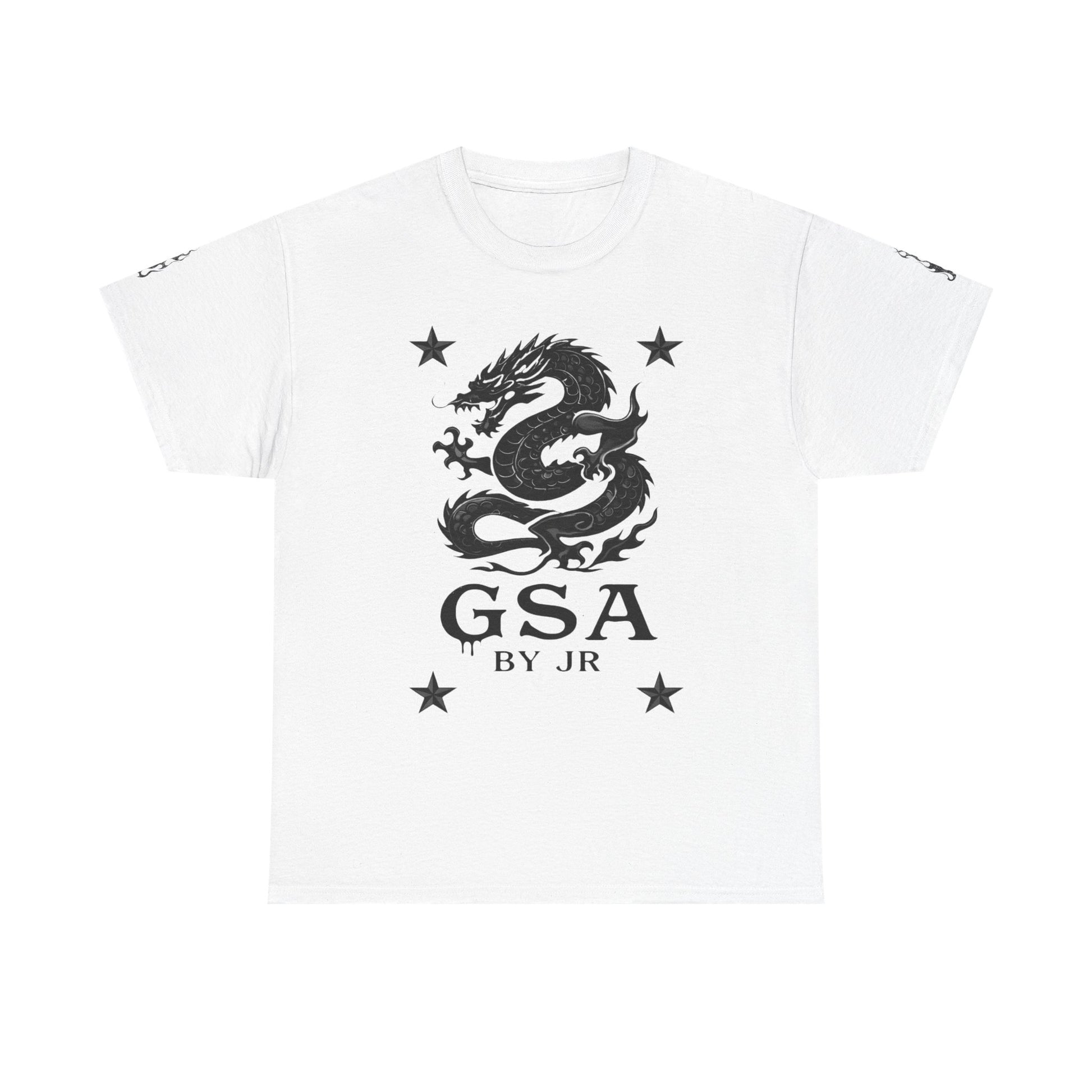 A clean, bold tee that wears like a quiet emblem of strength. The front features a hand-drawn black dragon and four stars, anchored by the simple “GSA by JR” mark—a graphic that reads confident without shouting. The medium-weight cotton feels substantial but breathable, so this shirt layers easily from morning errands to late-night hangs. Tubular construction and a ribbed collar keep lines smooth and the silhouette classic. Slip it on when you want something that feels familiar yet a little charged—an everyday statement for someone who favors subtle edge over flash.