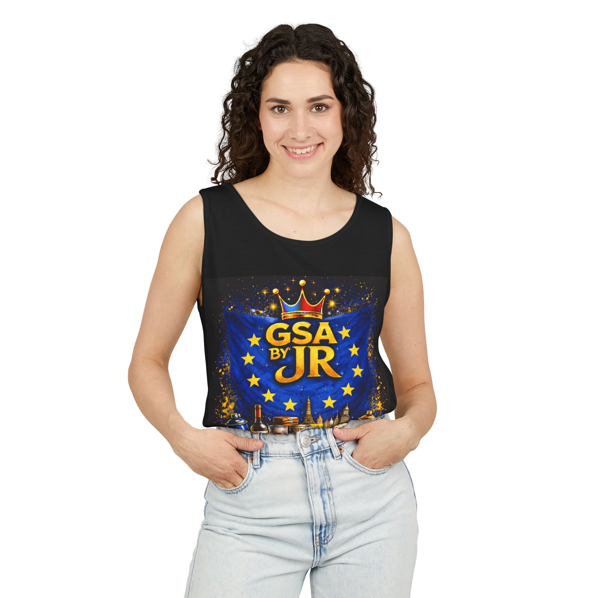 A garment-dyed cotton tank with a bold, celebratory print that channels European pride and festival energy. The relaxed fit and soft, vintage-like color from post-construction dyeing give it a lived-in feel — like a favorite concert tee you reach for when you want to be seen but still feel comfortable. The graphic centers on a crown, stars, and a festive array of bottles and glasses, making this tank feel like a nod to good times, local roots, and communal toasts. Wear it to summer street festivals, casual nights out, or backyard gatherings where conversation, music, and shared stories matter more than formality. It layers easily under an open shirt or stands alone when the temperature rises, keeping the vibe approachable and upbeat.