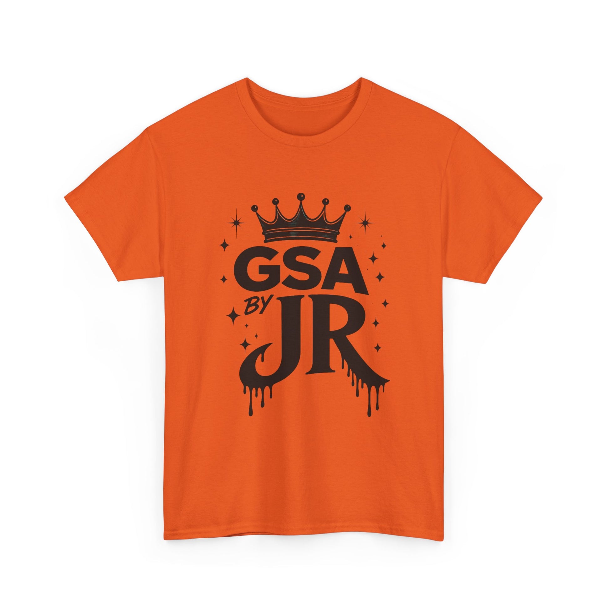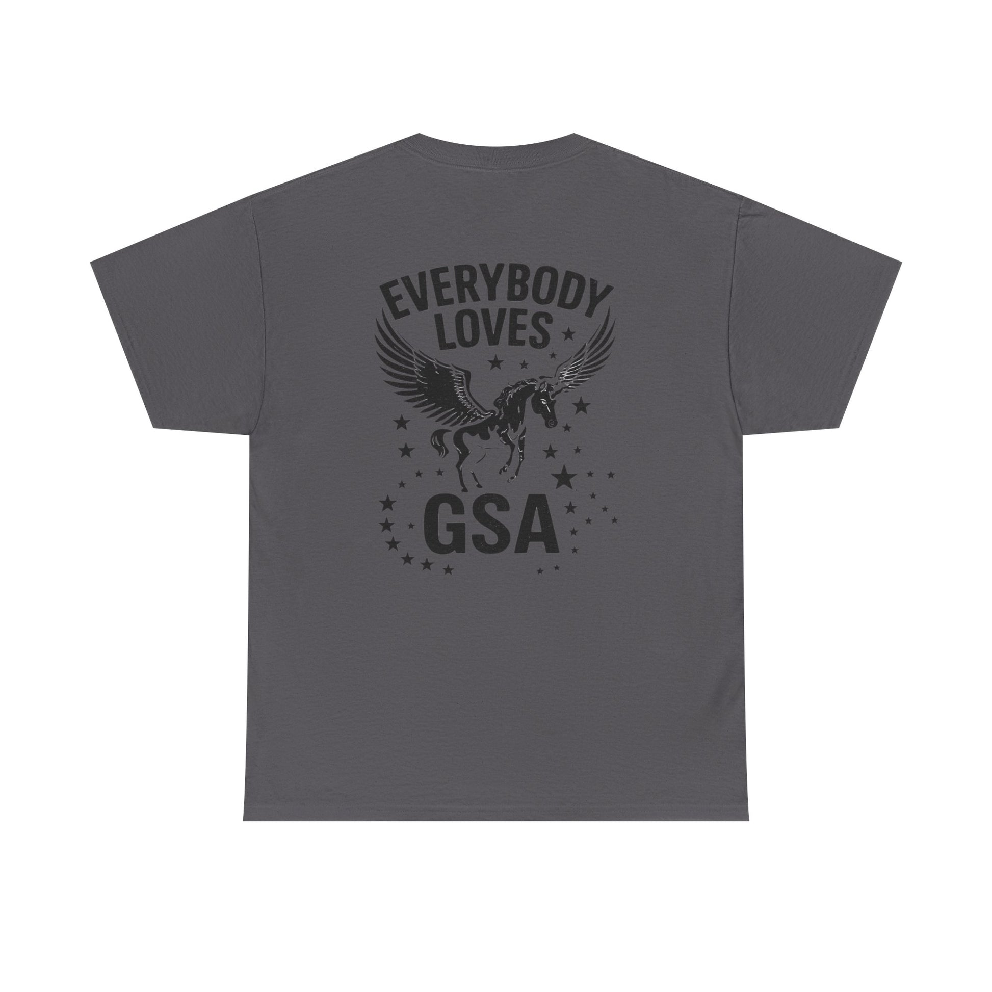 A soft, durable cotton tee that carries playful, streetwise energy. The front shows bold, stylized lettering crowned with a vintage crown motif and subtle drips — a nod to urban art and handcrafted grit. The back expands the story: a soaring winged horse framed by stars and the phrase “Everybody Loves GSA,” giving the shirt a proud, slightly rebellious vibe. Wear it to add attitude to everyday outfits, to show off crew or brand loyalty, or to layer under a jacket for evenings out. The medium-weight fabric feels sturdy but breathable, and details like the ribbed collar and tear-away label keep it comfortable all day. This shirt blends classic fit and reliable construction with bold, graphic storytelling for anyone who likes statement pieces that still move with them.