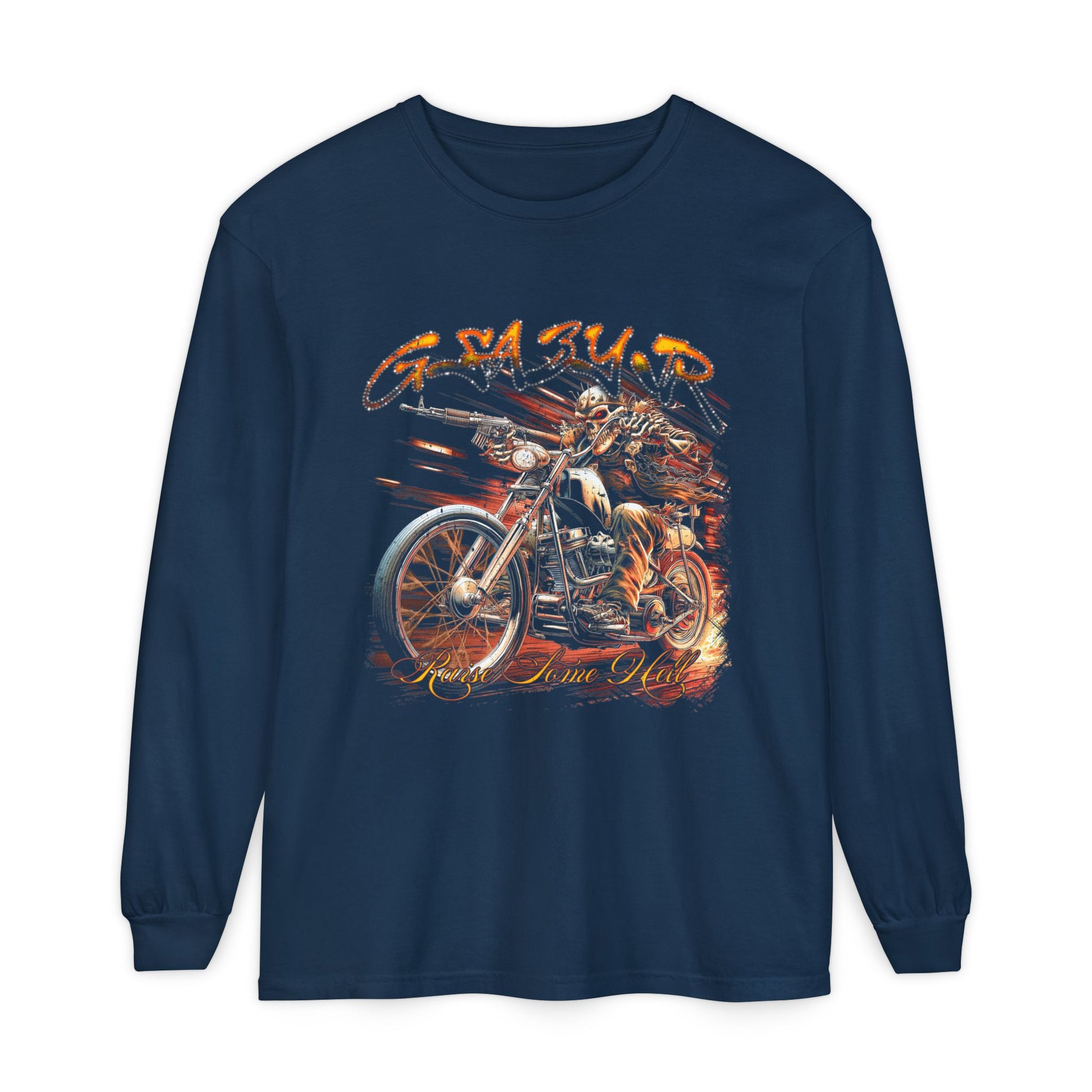 This garment-dyed long sleeve brings together soft-worn texture and rider-ready attitude. The lightly faded print of a roaring motorcycle and hand-lettered script sits on a relaxed, classic-fit silhouette — the kind of shirt you reach for on open-road mornings, late-night garage hangs, or slow Sunday rides. The medium-weight cotton drapes easily, the ribbed cuffs keep sleeves in place when layered under a jacket, and the double-stitched hems stand up to repeated wear. It’s simple, durable, and lived-in from the first wear, built to age with the stories you add to it.