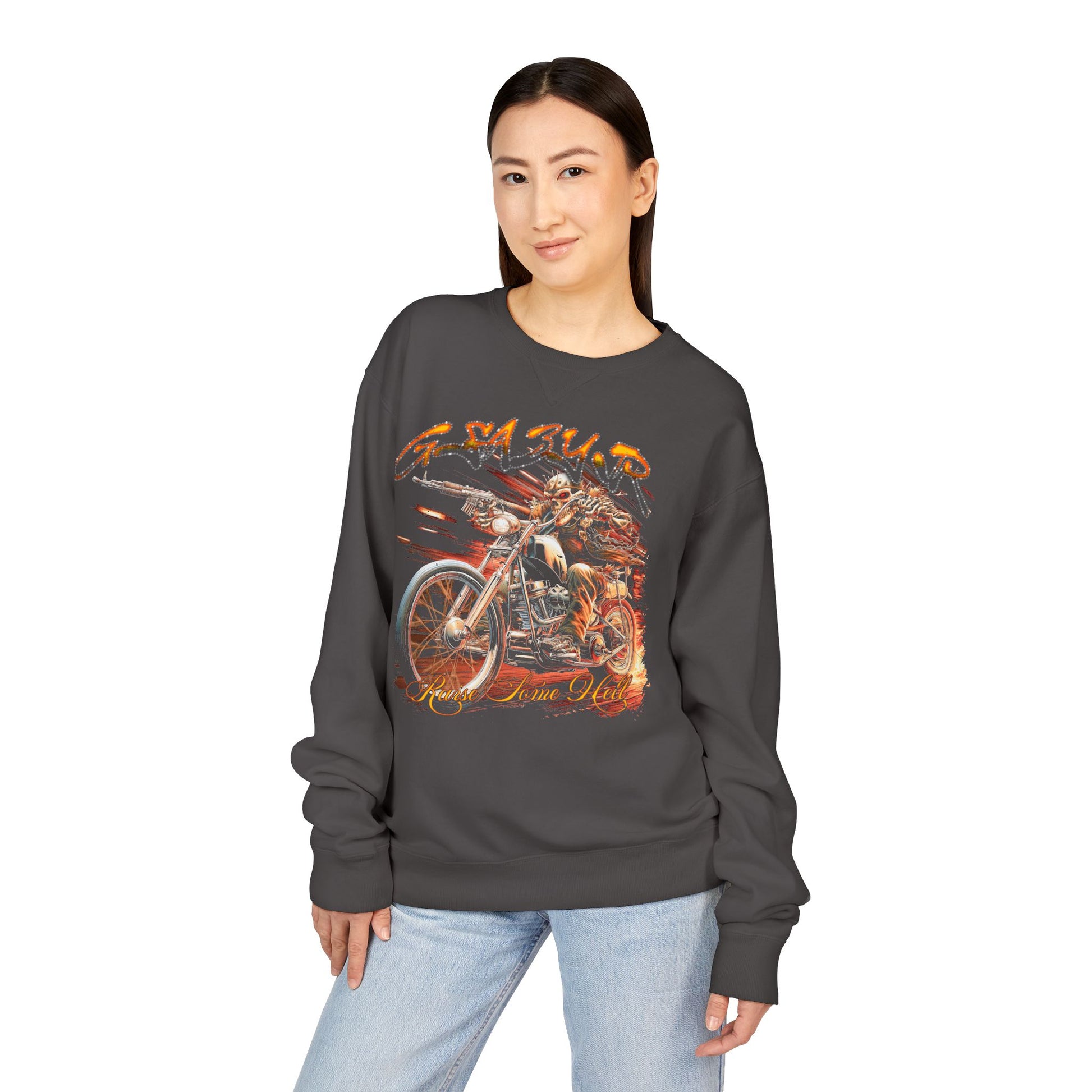 This vintage-washed crewneck carries the raw energy of open roads and late-night rides. The garment-dyed fleece has a lived-in, retro feel that lets the bold, flame-laced motorcycle artwork sit like a patch of memory on your chest and back. Midweight and soft to the touch, it layers easily over tees or under a leather jacket — the kind of sweatshirt you reach for when you want to feel gritty, warm, and unmistakably on the move. The print’s high-detail DTF finish keeps the colors bright against the muted, washed fabric so the design looks broken-in, not brand-new.