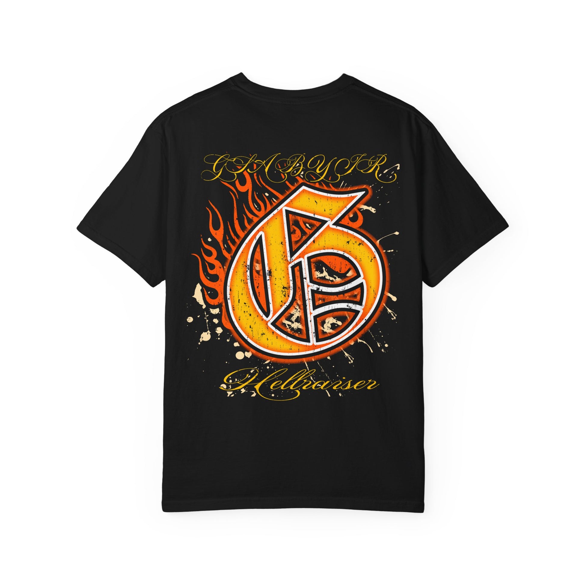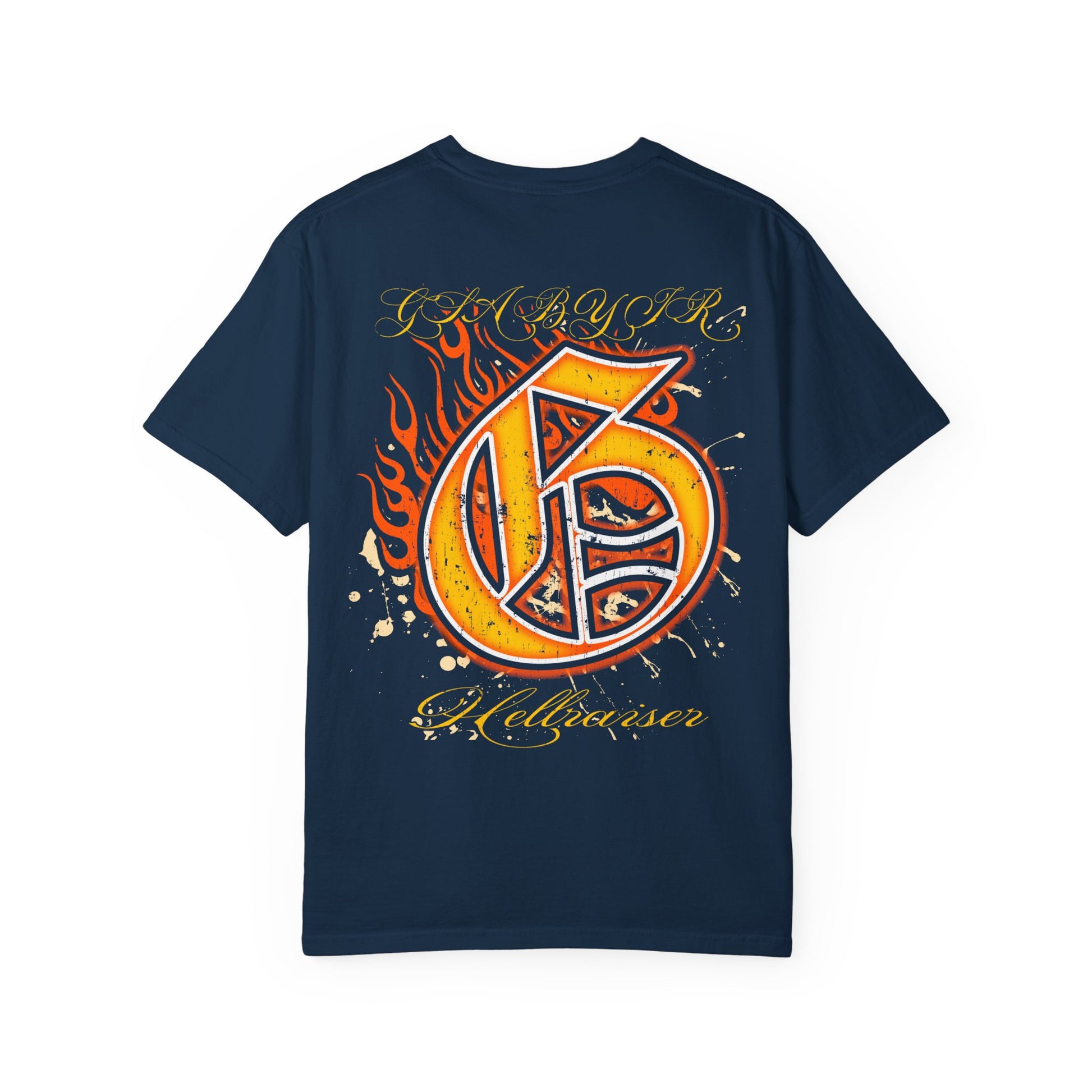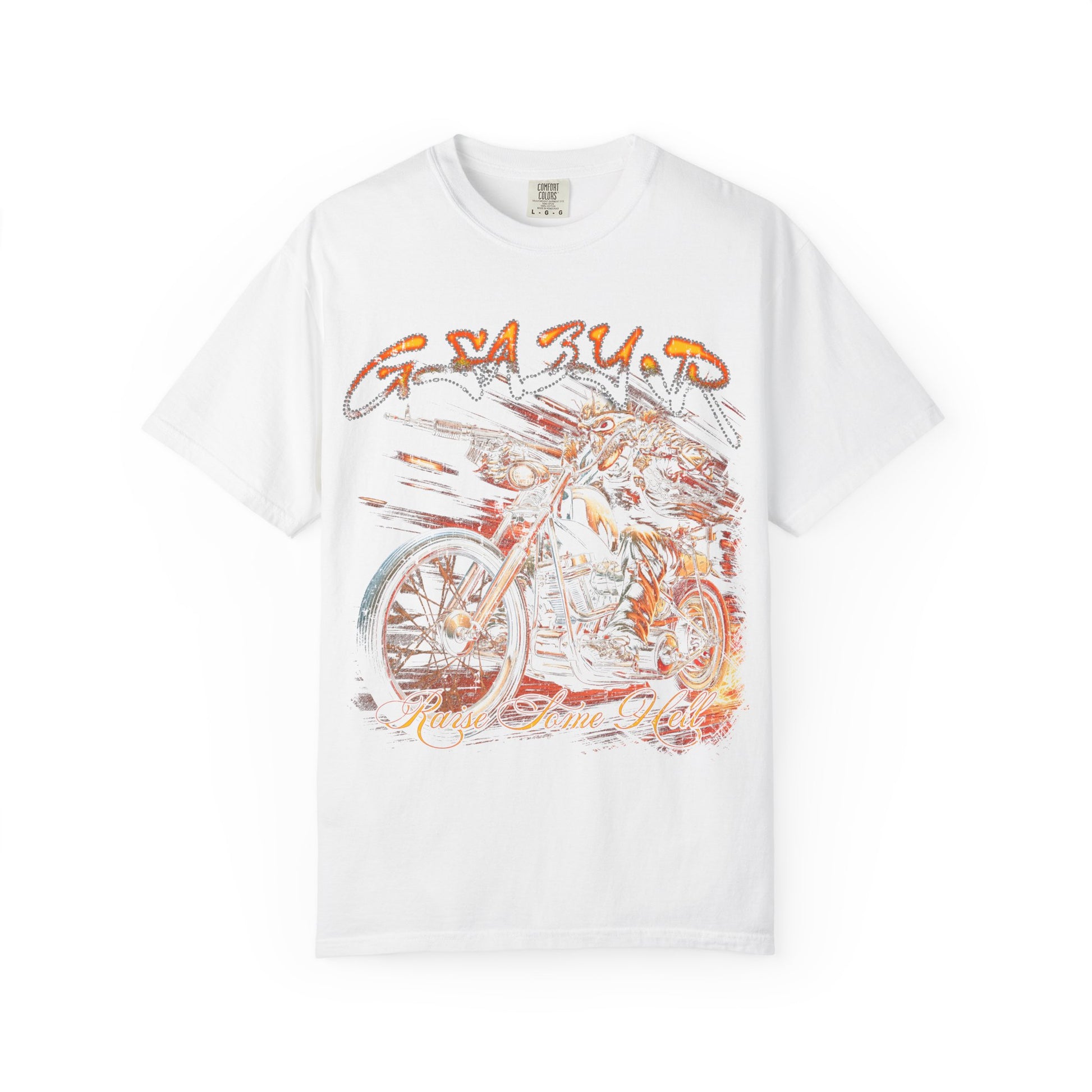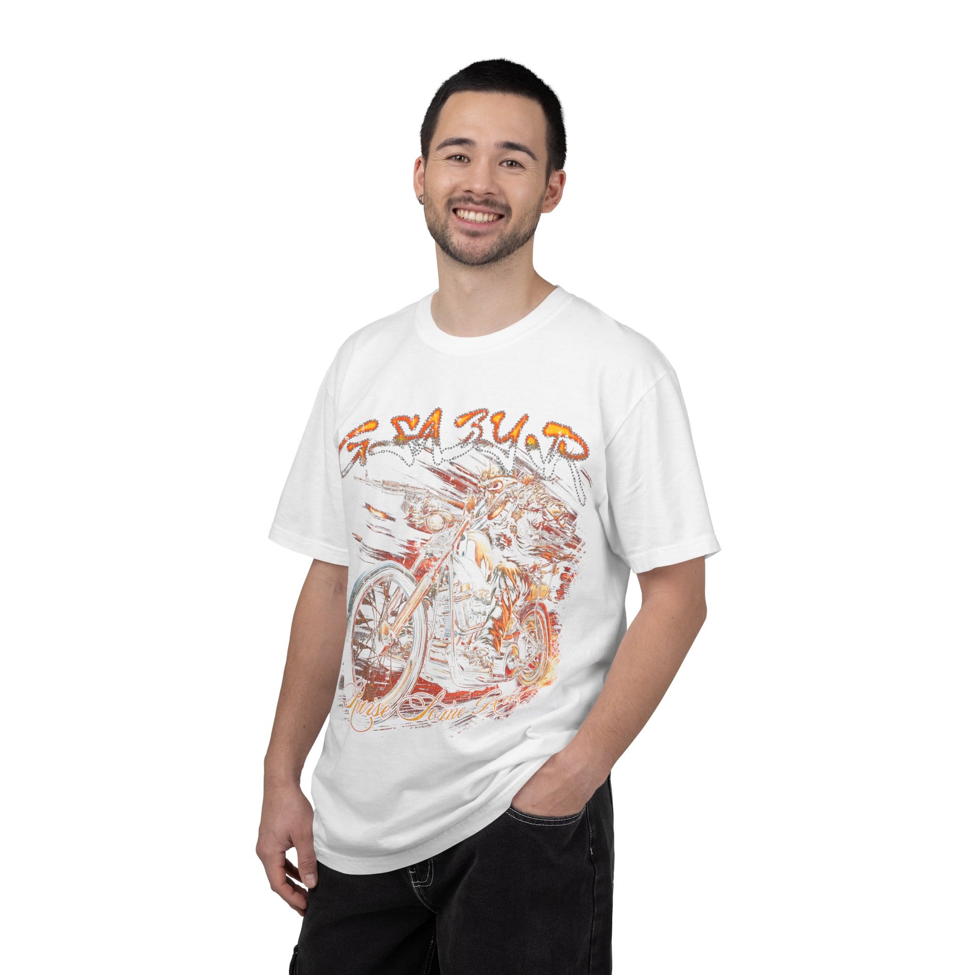 This heavyweight garment-dyed tee feels lived-in from the first wear. The front shows a gritty, sun-faded motorcycle scene rendered in warm, vintage tones; the back displays a bold, flame-trimmed emblem that reads like a roadside club patch. The relaxed cut and soft, garment-dyed finish give it a broken-in comfort that works with denim, leather jackets, or layered under a flannel. Built to last with double-needle seams and tubular construction, this shirt ages with you — the color and texture mellow over time, adding character to every ride and every memory.