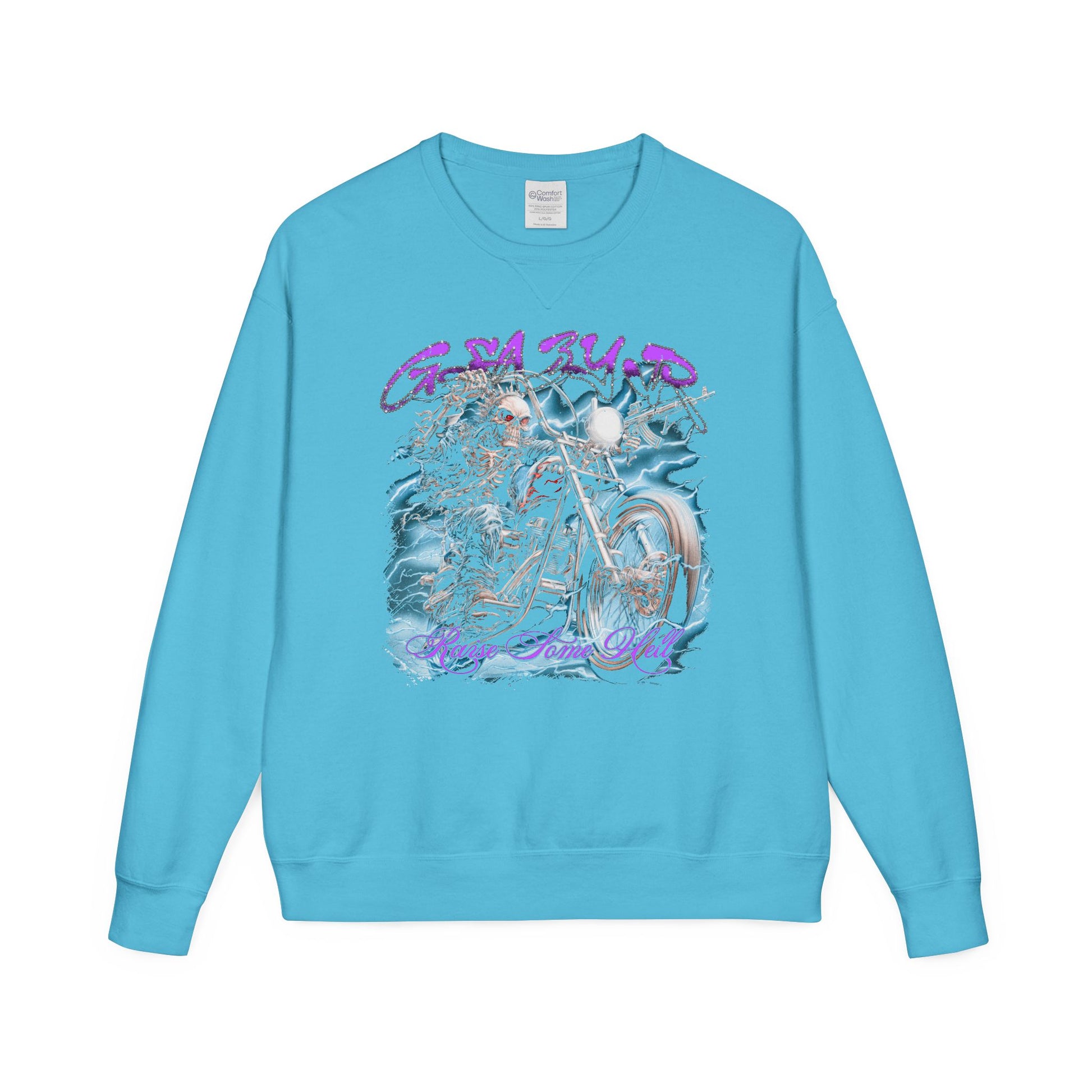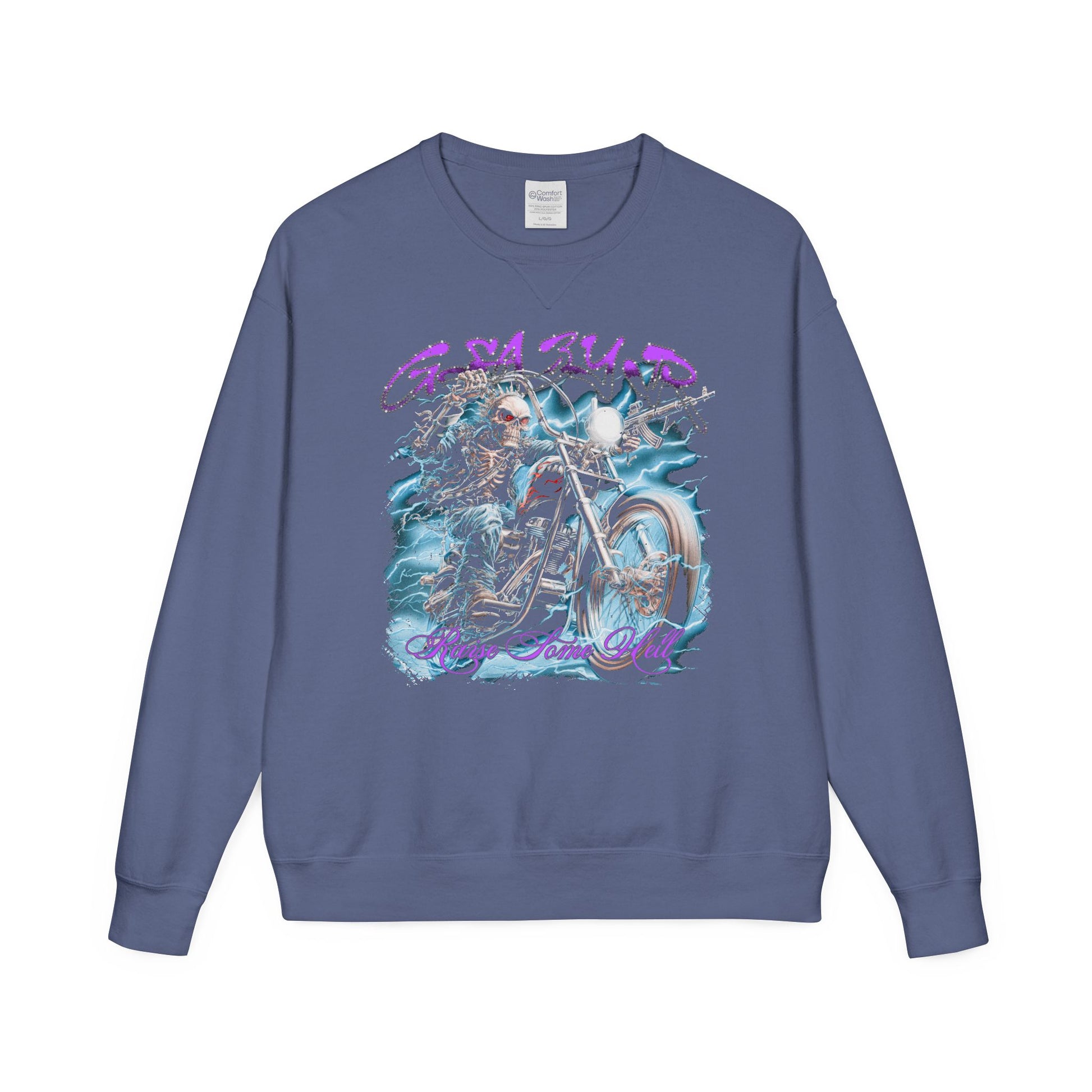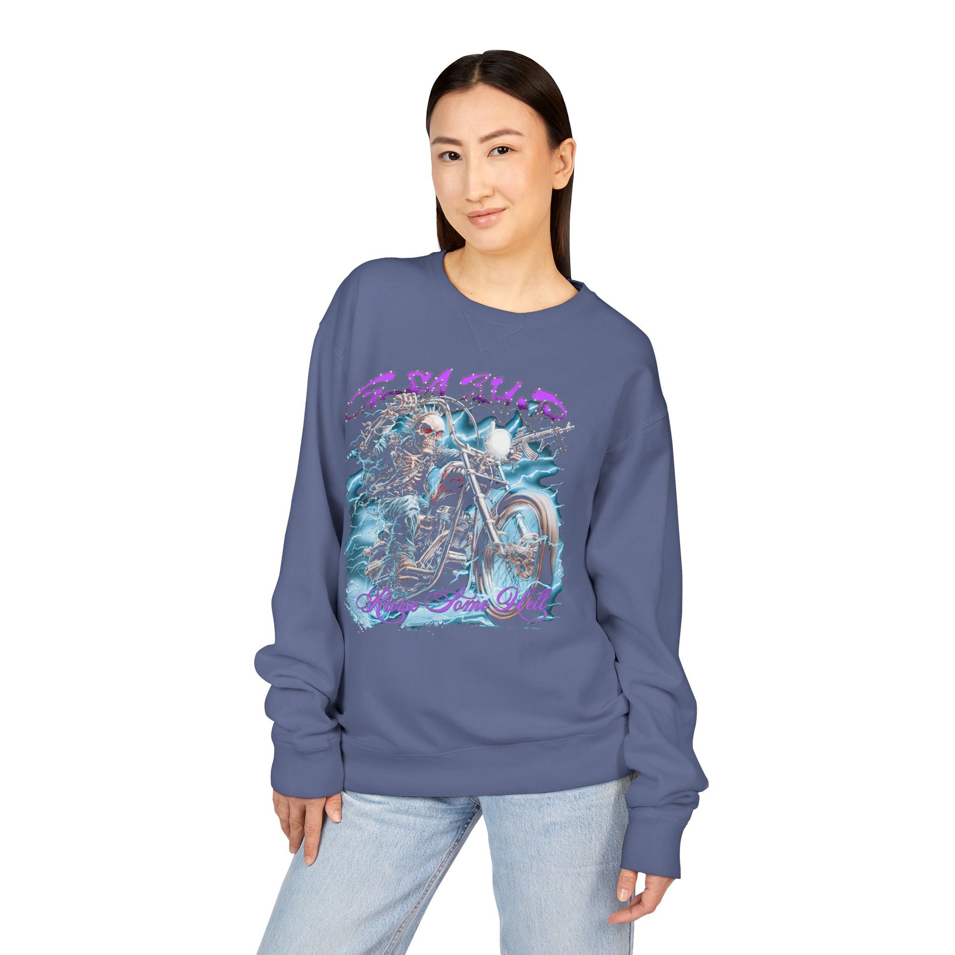 This crewneck sweatshirt brings a neon-soaked, retro biker vibe to cooler days. The front shows a chrome motorcycle bursting through electric blues and soft magenta highlights, while the back carries a flaming emblem in the same vivid palette. It feels lived-in from the first wear thanks to garment dyeing and vintage wash. Wear it on evening rides, late-night shows, or when you want that road-worn, rebellious energy without sacrificing comfort. The midweight fleece holds warmth without bulk, the lay-flat collar keeps its shape, and the DTF print keeps colors punchy ride after ride.