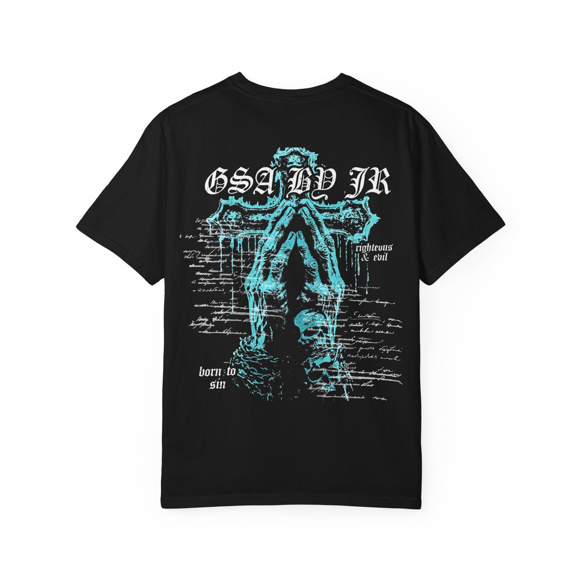 This heavyweight garment-dyed tee brings gritty, contemplative street art to your wardrobe. The front shows a weathered, crown-of-thorns figure in prayer, layered with distressed textures and moody blue highlights. The back continues the story with a ghostly, kneeling silhouette and cryptic type, giving the shirt a raw, underground gallery vibe. Built for relaxed, everyday wear, the shirt’s soft, washed-in color and sturdy construction let the art age naturally with you. Wear it when you want to make a quiet, powerful statement—at shows, late-night sessions, or when you’re out hunting inspiration in the city.