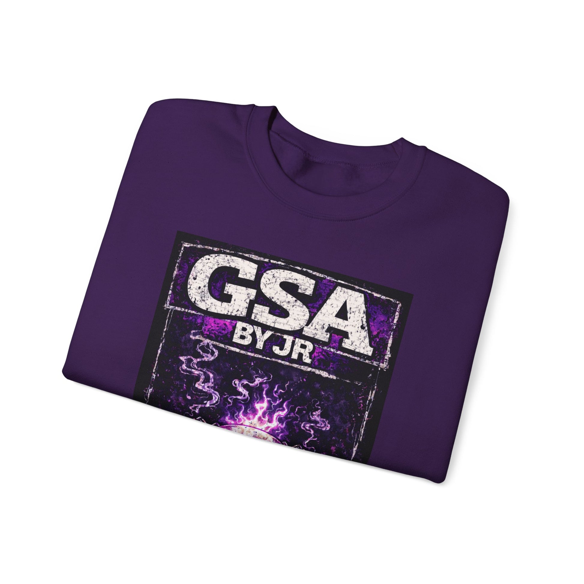 A heavy, laid-back crewneck built to carry bold graphics and louder attitudes. This mid-weight sweatshirt pairs a roomy, classic fit with durable double-needle stitching and a soft, tubular knit body so the fabric drapes cleanly without side seams. The graphic — a gritty, purple-accented skull and smoke motif with bold 'GSA' lettering — reads like a band tee or streetwear patch, giving the piece a rebellious, late-night energy. Wear it to skate spots, basement shows, or on slow city walks when you want something that feels lived-in but built to last. The ribbed collar and cuffs hold their shape, and the tear-away label keeps the neck itch-free. Ethically sourced US cotton and OEKO-TEX certified dyes mean the sweatshirt looks rough and rowdy while meeting modern safety and environmental standards.