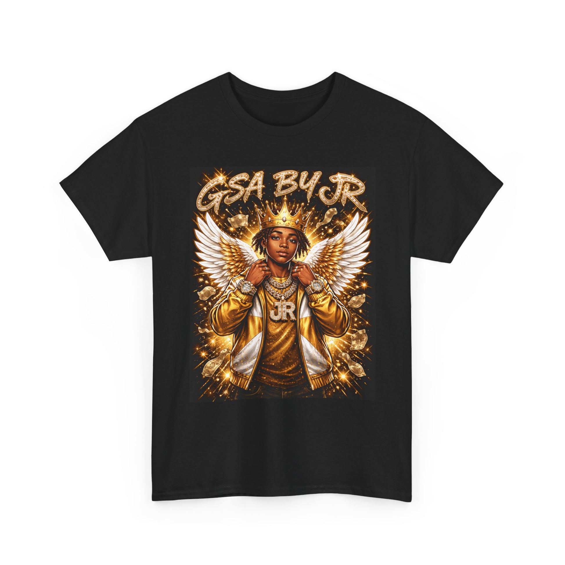 This black cotton tee carries a bold street-art energy — a regal young figure crowned and flanked by golden wings, layered with rich metallic tones and tight illustrative detail. Wear it when you want your look to speak: the medium-weight fabric holds vibrant DTG/DTF prints with crisp edges, while the classic crew and relaxed cut keep the silhouette easy and wearable. It sits naturally in the wardrobe of someone who collects statement graphics and values ethically sourced materials, bringing warmth and attitude to shows, meetups, or everyday city life.